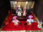 ディスプレイコーナーにぴったり合うように、今年は毛氈(もうせん)の幅を直してみたのですが。昨年までは片側を裏に織り込んでいたの。